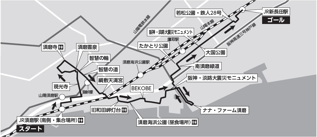 JR 須磨駅【スタート】~現光寺~須磨寺~須磨霊泉~須磨智慧の道(智慧の輪)~綱敷天満宮~旧和田岬灯台~須磨海浜公園【昼食】~BEKOBE ~阪神・淡路大震災モニュメント~ナナ・ファーム須磨(お買物)~南須磨緑道~大国公園・阪神淡路大震災モニュメント~若松公園・鉄人28号~JR 新長田駅【ゴール】